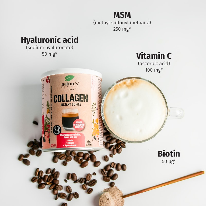 Colágeno en polvo, café instantáneo, almidón de tapioca, MSM, vitamina C, ácido hialurónico, biotina.
