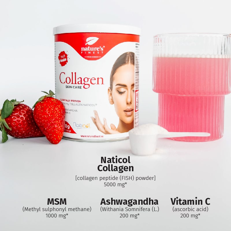 Ingredientes: Polvo de colágeno hidrolizado de pescado Naticol® (50%), maltodextrina, MSM (metil sulfonil metano), polvo de ashwagandha, sabor natural de fresa (2%), polvo de remolacha (1%), estabilizador: polvo de celulosa, vitamina C, glucósidos de esteviol.